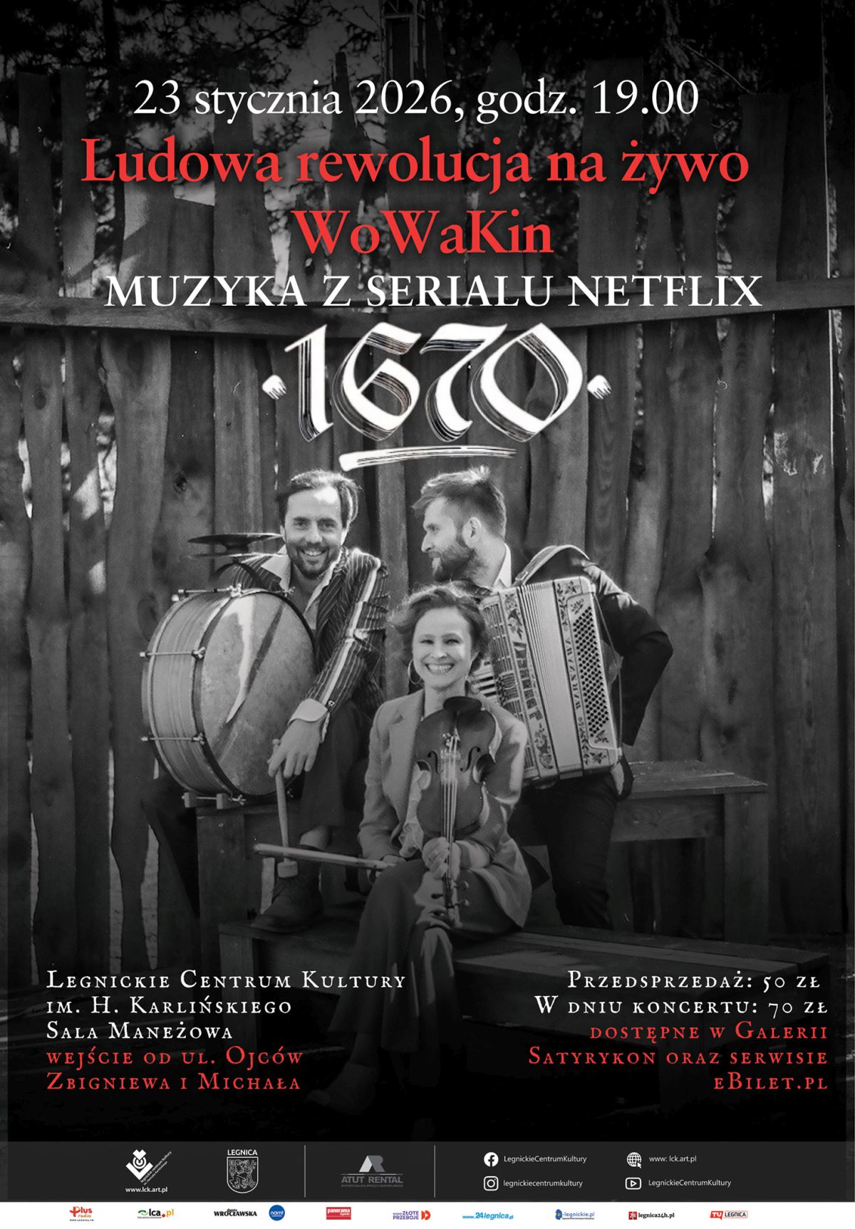 Zapraszamy na koncert zespołu WoWaKin, który 23 stycznia o godzinie 19:00 w Sali Maneżowej Akademii Rycerskiej (wejście od ul. Ojców Zbigniewa i Michała) zaprezentuje muzykę z przebojowego serialu Netflix „1670”.