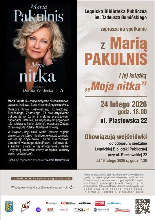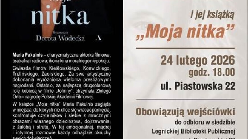 Legnicka Biblioteka Publiczna im. Tadeusza Gumińskiego zaprasza na spotkanie z Marią Pakulnis – wybitną aktorką filmową, teatralną i radiową – połączone z promocją książki „Moja nitka”, będącej zapisem rozmowy z Dorotą Wodecką.