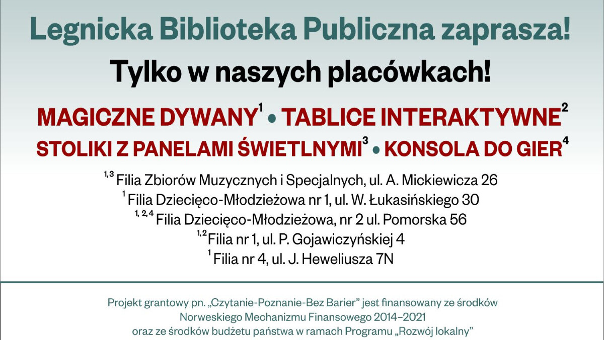 Gmina Legnica we współpracy z Legnicką Biblioteką Publiczną pozyskała 100 000 złotych z Mechanizmu Finansowego EOG na lata 2014–2021 oraz Norweskiego Mechanizmu Finansowego na lata 2014–2021. Zakupiono sprzęt multimedialny, który uatrakcyjnił ofertę biblioteczną skierowaną do osób niepełnosprawnych, dzieci i młodzieży oraz dorosłych.