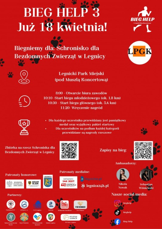 Po raz trzeci Legnica pobiegnie w szczytnym celu. Trwają zapisy na 3. Legnicki Bieg Charytatywny „BIEG HELP”, który odbędzie się 18 kwietnia 2026 r. w Parku Miejskim w Legnicy. Zawodnicy będą sportowo rywalizować między sobą, by wesprzeć Schronisko dla Bezdomnych Zwierząt w Legnicy.