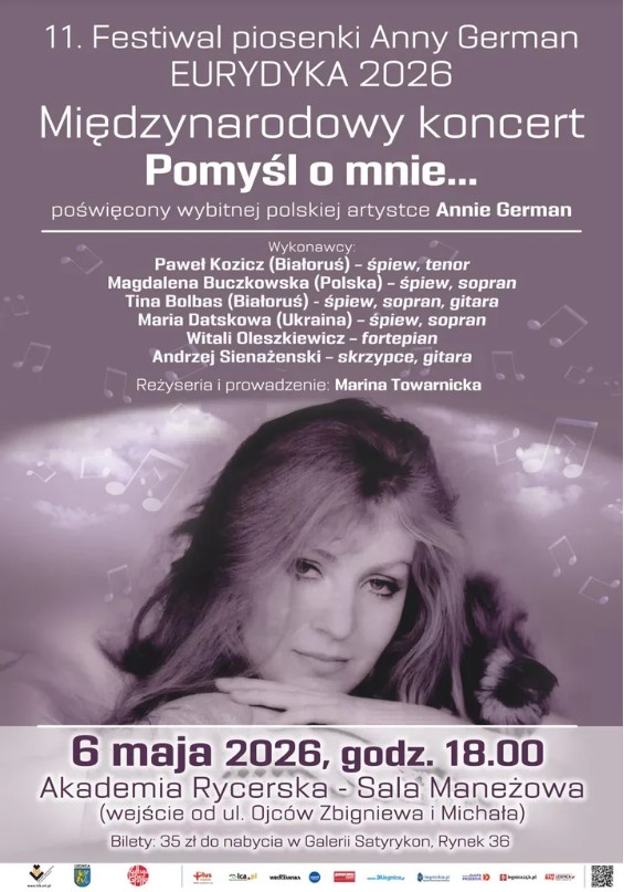 Wieczór pod tytułem „Pomyśl o mnie…” jest częścią XI Festiwalu Piosenki Anny German „Eurydyka” i został pomyślany jako muzyczne spotkanie z twórczością artystki, która wciąż ma w Polsce ogromne grono słuchaczy. Koncert wyreżyseruje i poprowadzi Marina Towarnicka, prezes Fundacji „Kultura Bez Granic” we Wrocławiu . W praktyce oznacza to program oparty na autorskich interpretacjach i nowych aranżacjach znanych utworów - w solo, duecie, kwartecie i z instrumentarium, które ma dodać całości wyraźnego, koncertowego nerwu ✨